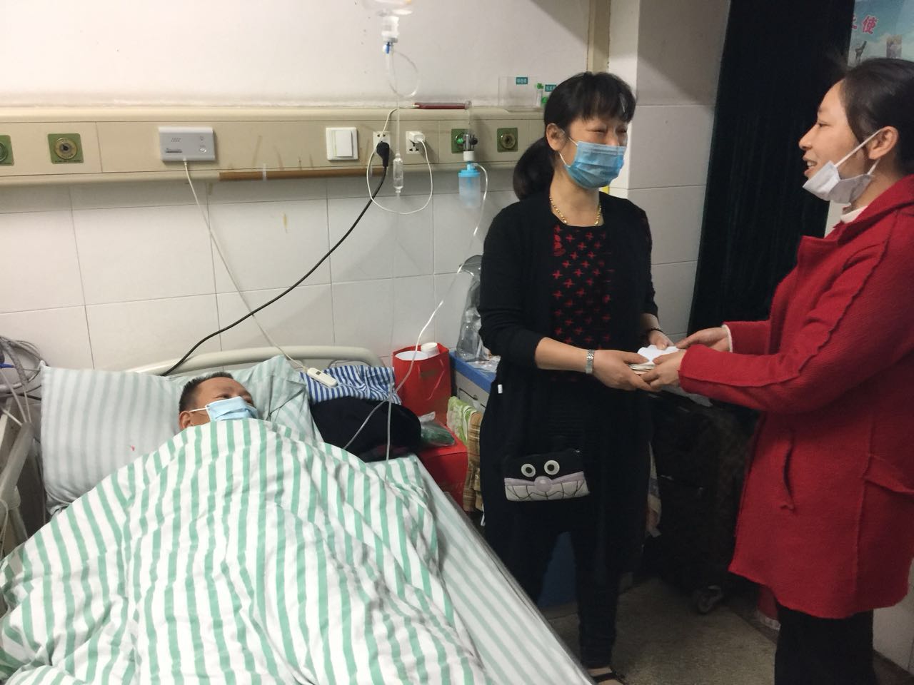 3月26日,91视频在线工會主(zhǔ)席蔣俊、行政部林梅、員工汪明富帶著91视频在线所有員工的愛心來到醫院看望。薑偉文正在照料病床上的愛人,並發症引(yǐn)起口角潰瘍無法進食,每天24小時隻能靠鹽水維持,身形消瘦,身體虛弱,昔日(rì)150斤的錚錚硬漢,如今隻有110斤了,讓人無(wú)不動容。