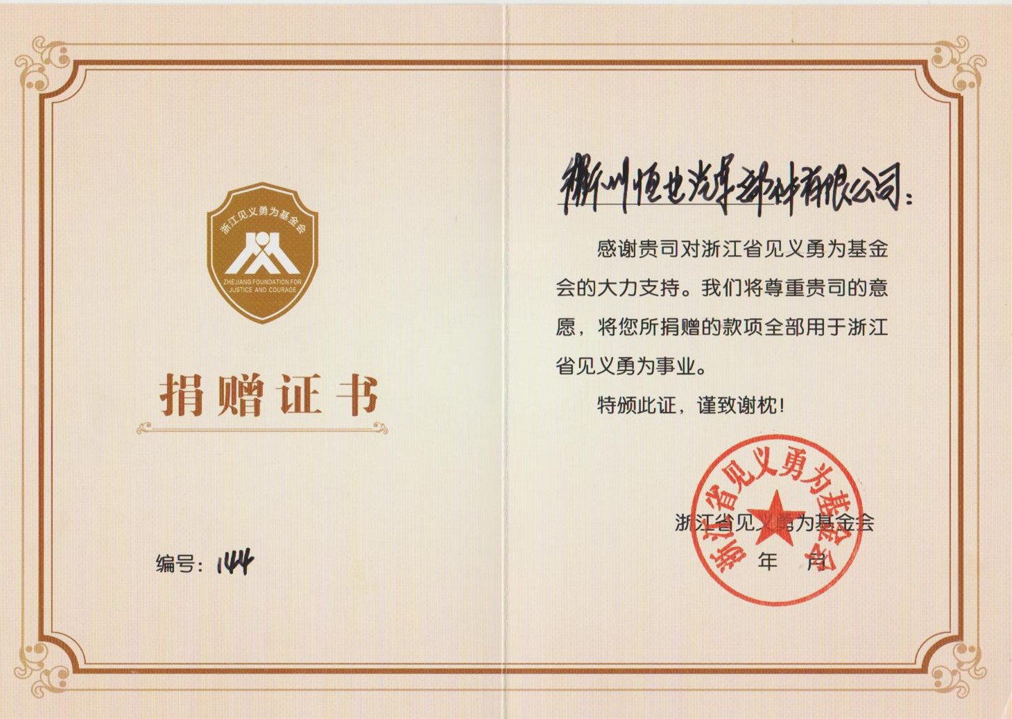 91视频在线公司在發展生(shēng)產的同(tóng)時,始終把(bǎ)履行(háng)社會職責放(fàng)在首位,“奉獻(xiàn)愛心,回報(bào)社(shè)會”是恒(héng)業不變的(de)信念,汶川大地震,患病困難(nán)員工,經濟拮據家庭……一份份捐款(kuǎn),一份份關愛(ài),從董事長到(dào)普通員工的(de)愛(ài)心接力,凝聚著員工的團(tuán)隊精神,彰顯了91视频在线的大愛無疆。2017年榮獲“履行社會義務先進會員”稱號,就(jiù)是對恒(héng)業****的肯定和讚許。